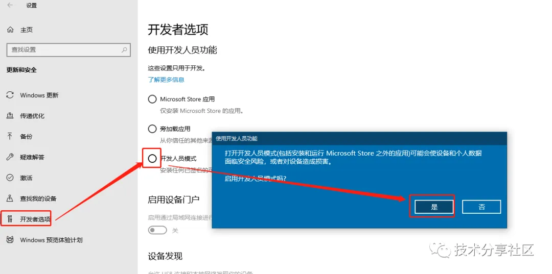 开始---->设置------>更新和安全------->开发者选项------>开发人员模式,出来确认对话框时选择《是》