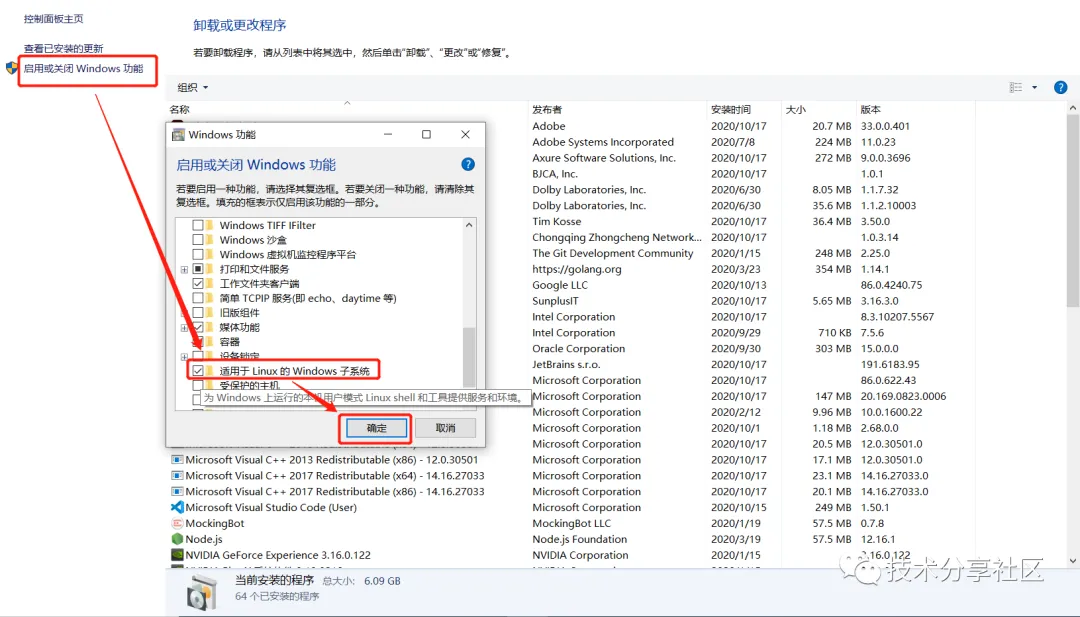 c、启用适用于Linux的windows子系统设置
