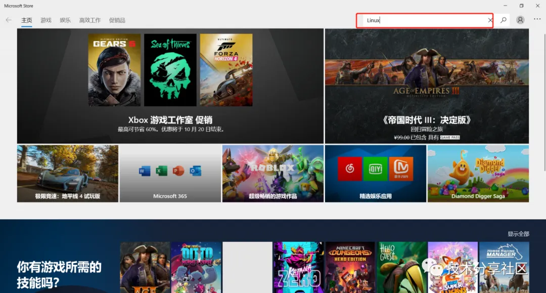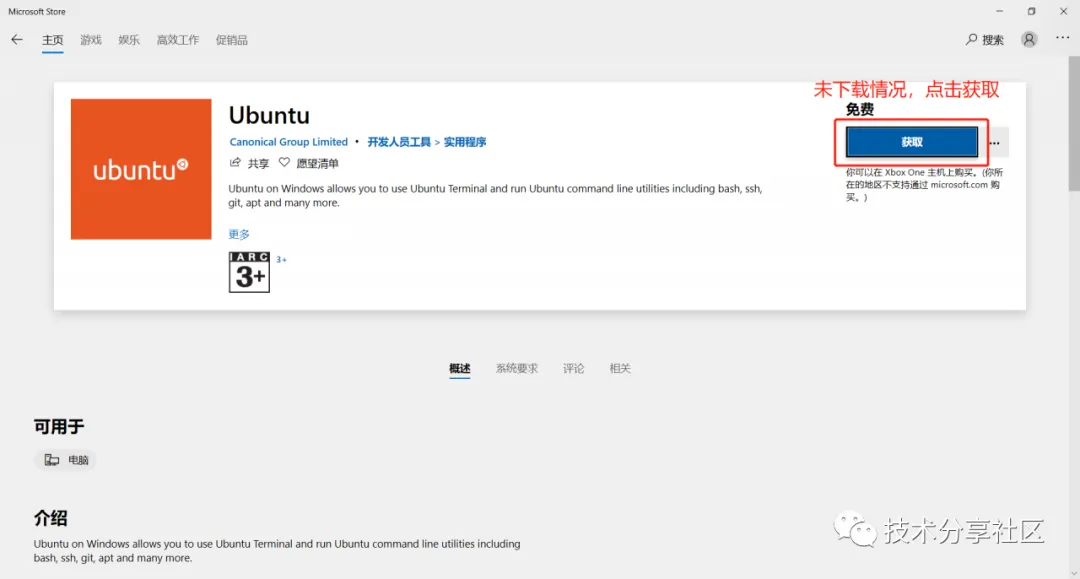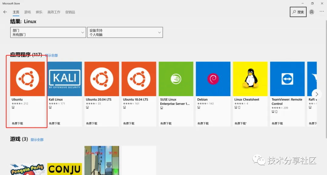 开始菜单--->打开Microsoft Store-------在搜索框中输入Linux-----查找-----选择Ubuntu-----安装(下载和安装需要一定时间)-安装完成后启动即可