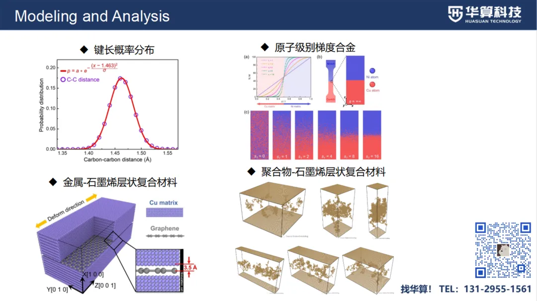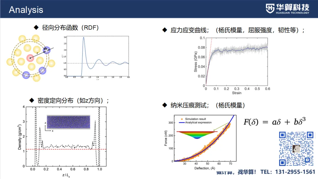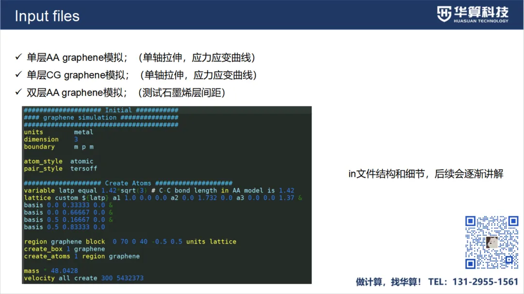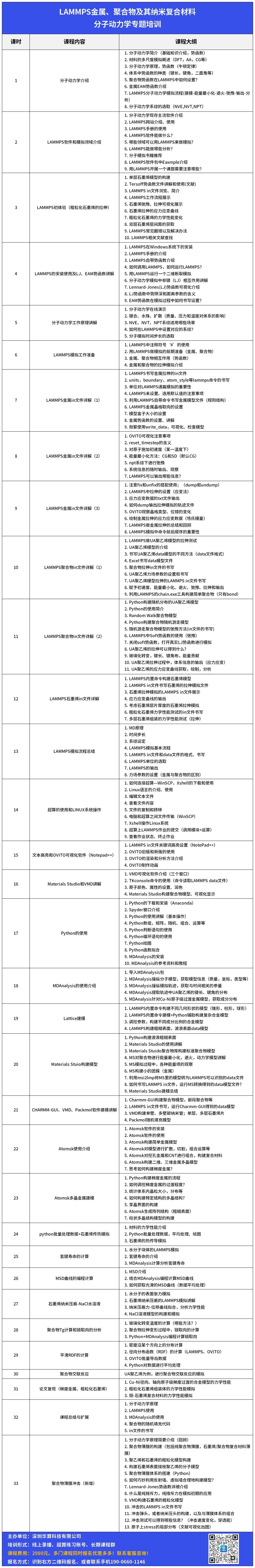 1. Charmm-GUI构建聚合物模型,嵌段聚合物等2. LAMMPS in文件书写,运行Charmm-GUI得到的data模型3. VMD构建单壁、多壁碳纳米管;单层、多层石墨烯片4. Atomsk对模型进行扩胞,切割,组合运算等5. Atomsk对挖孔金属和CNT进行组合,构建复合材料3. Python+MDAnalysis编程计算链取向2. 径向分布函数(RDF)的计算(LAMMPS、OVITO)1. Cu-Ni径向、轴向原子级梯度过渡的合金模型的力学性能主办单位:深圳华算科技有限公司(拥有VASP、Materials Studio、Gaussian商业版权)培训形式:线上课程,28小时录播,无限次回看,课程群永不解散,随时提问,及时解答。课程费用:2980元。名额有限,欲报从速!提供增值税普通发票及邀请函。报名方式:识别下方二维码报名,或者联系手机190-0660-1146 。可刷公务卡,请扫码填写报名信息以便我们提前为您准备发票等报销手续。划重点:请先添加课程客服微信报名再缴费!