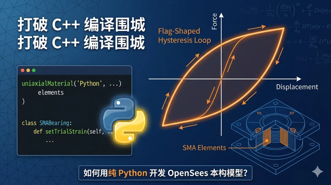 import openseespy.opensees as ops class SMABearing: """ 新型 SMA 自复位隔震支座本构模板 (Python 类实现) 特点:无需编译,直接在 Python 脚本中运行 """ def __init__(self, tag, E_elastic, fy_forward, beta=0.6): self.tag = tag self.E = E_elastic# 初始弹性刚度 self.fy_f = fy_forward # 正向相变力(屈服力) self.beta = beta # 能量耗散系数(决定旗帜形状的宽度) # --- 核心状态变量 --- self.t_strain = 0.0 # Trial: 当前步试算应变 self.t_stress = 0.0 # Trial: 当前步试算应力 self.t_tangent = E_elastic self.c_strain = 0.0 # Committed: 上一步收敛应变 self.c_stress = 0.0 # Committed: 上一步收敛应力 def setTrialStrain(self, strain, strainRate=0.0): """ 核心本构逻辑逻辑:每步迭代时 OpenSees 会自动调用 """ self.t_strain = strain delta_strain = self.t_strain - self.c_strain # 简化版 Flag-shaped 逻辑示例 trial_stress = self.E * self.t_strain # 根据加载/卸载分支判定应力和切线刚度 # 这里可以植入你推导的任何数学公式、微分方程甚至 AI 模型 if abs(trial_stress) > self.fy_f: self.t_stress = self.fy_f + 0.02 * self.E * (self.t_strain - self.fy_f/self.E) self.t_tangent = 0.02 * self.E else: self.t_stress = trial_stress self.t_tangent = self.E return 0 def getStress(self): return self.t_stress def getTangent(self): return self.t_tangent def commitState(self): """当迭代收敛,将 Trial 状态固化为 Committed 状态""" self.c_strain = self.t_strain self.c_stress = self.t_stress return 0 # --- 在 OpenSeesPy 中调用 --- # 1. 实例化 Python 对象 sma_logic = SMABearing(tag=101, E_elastic=2000.0, fy_forward=50.0) # 2. 注入接口:这行代码代替了传统的 C++ 编译插件 ops.uniaxialMaterial('Python', 101, sma_logic) # 3. 之后像正常材料一样使用 # ops.element('zeroLength', 1, iNode, jNode, '-mat', 101, '-dir', 1) |