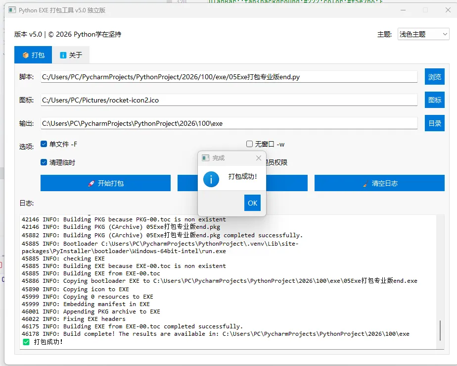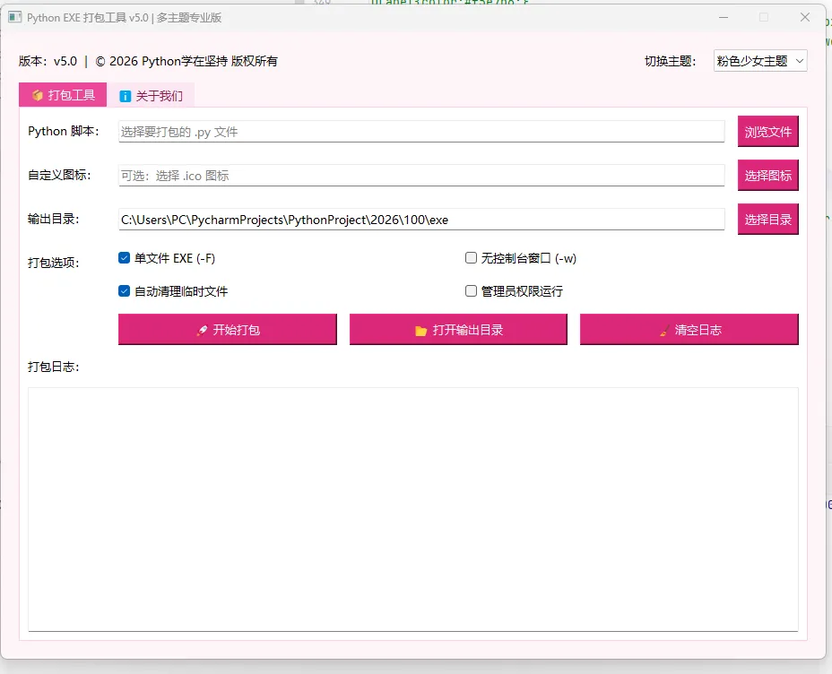功能全覆盖✔ 单文件 exe(-F):只生成一个文件,发送超方便 ✔ 无控制台窗口(-w):做桌面软件不弹黑框 ✔ 自定义图标(-i):给软件换上专属 logo ✔ 压缩打包:减小文件体积 ✔ 32/64 位自动适配,Windows 全版本兼容