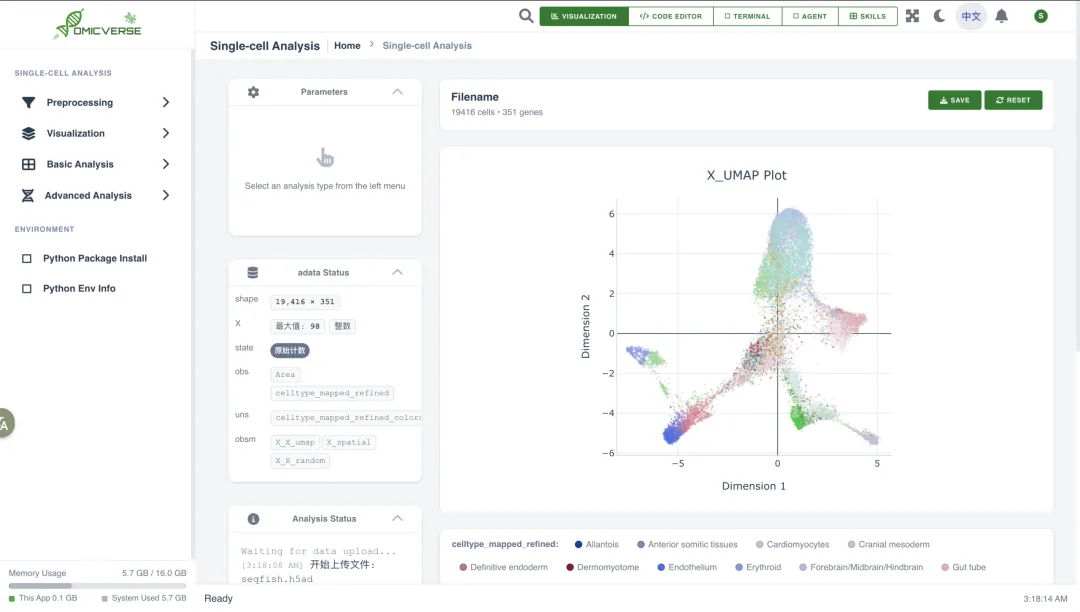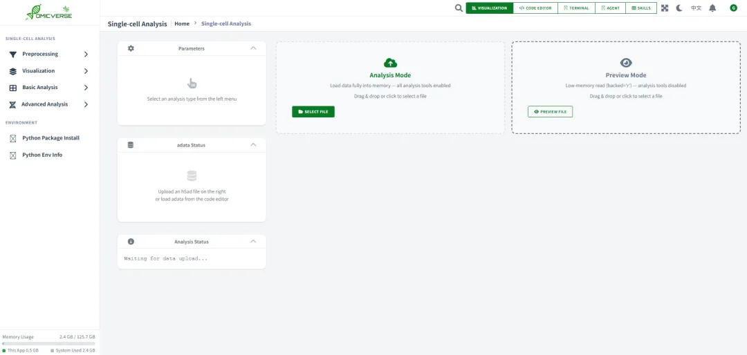 omicverse-web --port 8080# 指定端口omicverse-web --no-debug # 关闭调试模式(生产环境推荐)omicverse-web --remote # 远程模式(配合 SSH 隧道)7. 界面概览