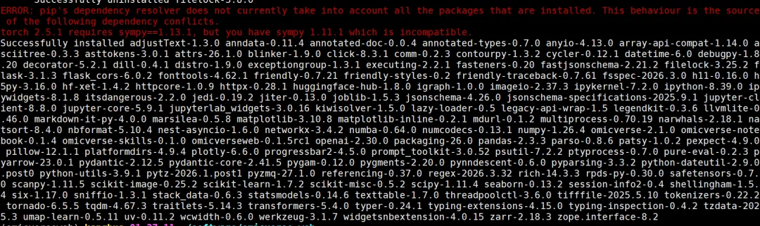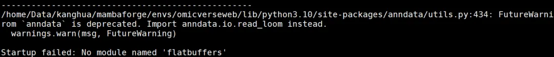 在安装omicverse-web时,在我们自己的服务器中,会出现缺失一些Python包,可能每个人遇到的缺失包不一样,你缺失什么包就使用pip安装什么包。