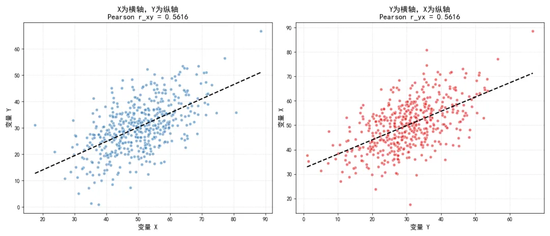 ax1.set_title(f'X为横轴,Y为纵轴\nPearson r_xy = {r_xy:.4f}', fontsize=14)