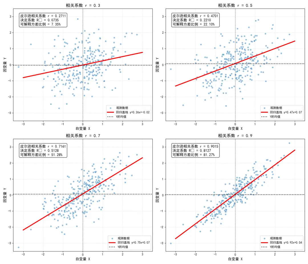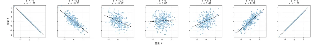 我们通过代码可视化不同相关系数下的散点分布,直观展示相关系数从到的变化过程,以及完全线性相关的边界情况。