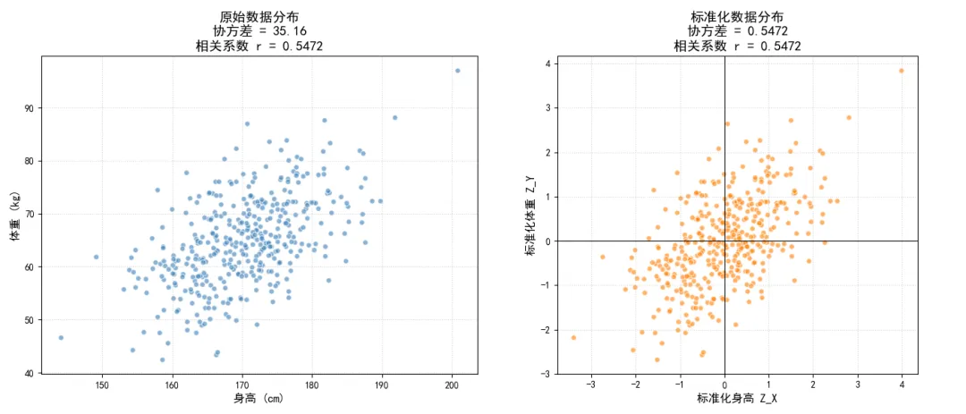 我们通过代码验证这个等价性,同时对比原始数据与标准化数据的分布变化。