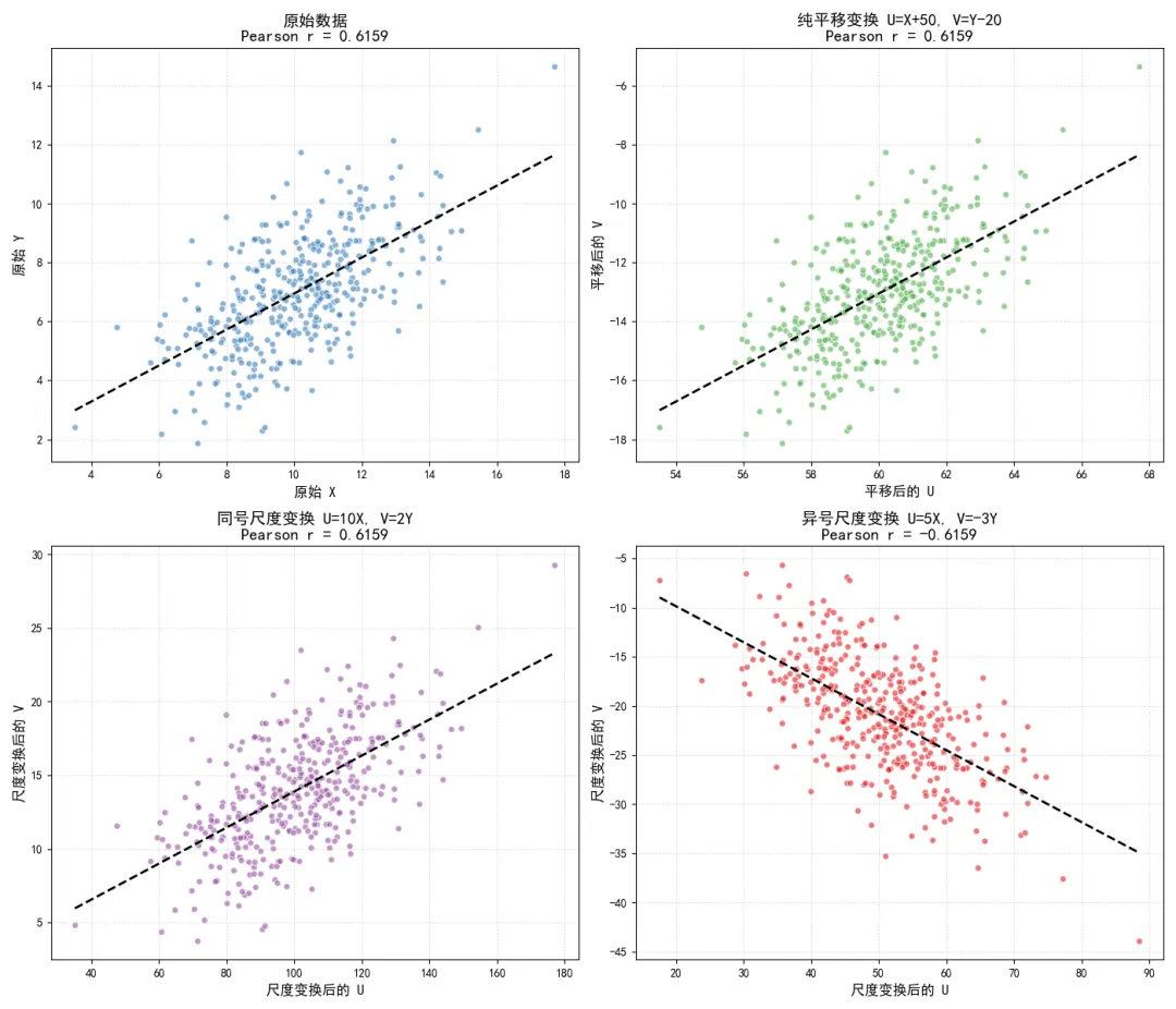 这个性质表明皮尔逊相关系数是剔除了变量自身尺度与位置影响后,纯粹的线性协同波动程度。
