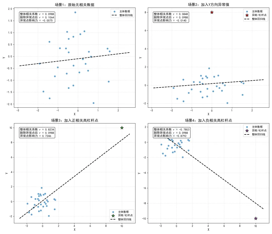在扰动性质层面,我们量化了异常值与高杠杆点对相关系数的影响力,通过模拟实验展示了单个极端点对相关系数的强扰动性,明确了皮尔逊相关系数的非稳健性。