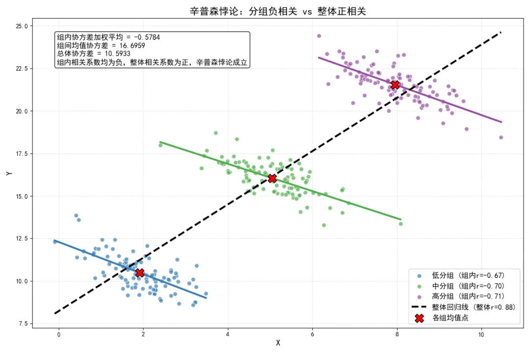 在分组数据性质层面,我们通过全相关定律拆解了总体相关系数的组内与组间效应,明确了辛普森悖论的数学条件,揭示了聚合数据带来的生态谬误,强调了分层分析的重要性。