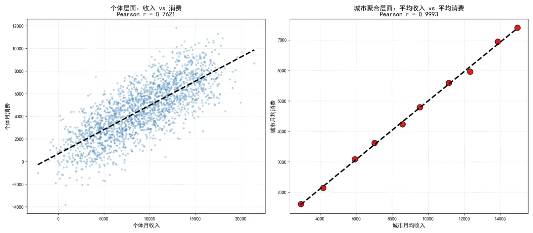 从模拟结果可以看到,个体层面收入与消费的相关系数仅为 左右,属于弱相关;但聚合到城市层面后,相关系数接近,呈现出完美的正相关。如果我们直接用城市层面的强相关,推断个体收入越高消费越高,就会严重高估个体层面的相关强度,陷入生态谬误。