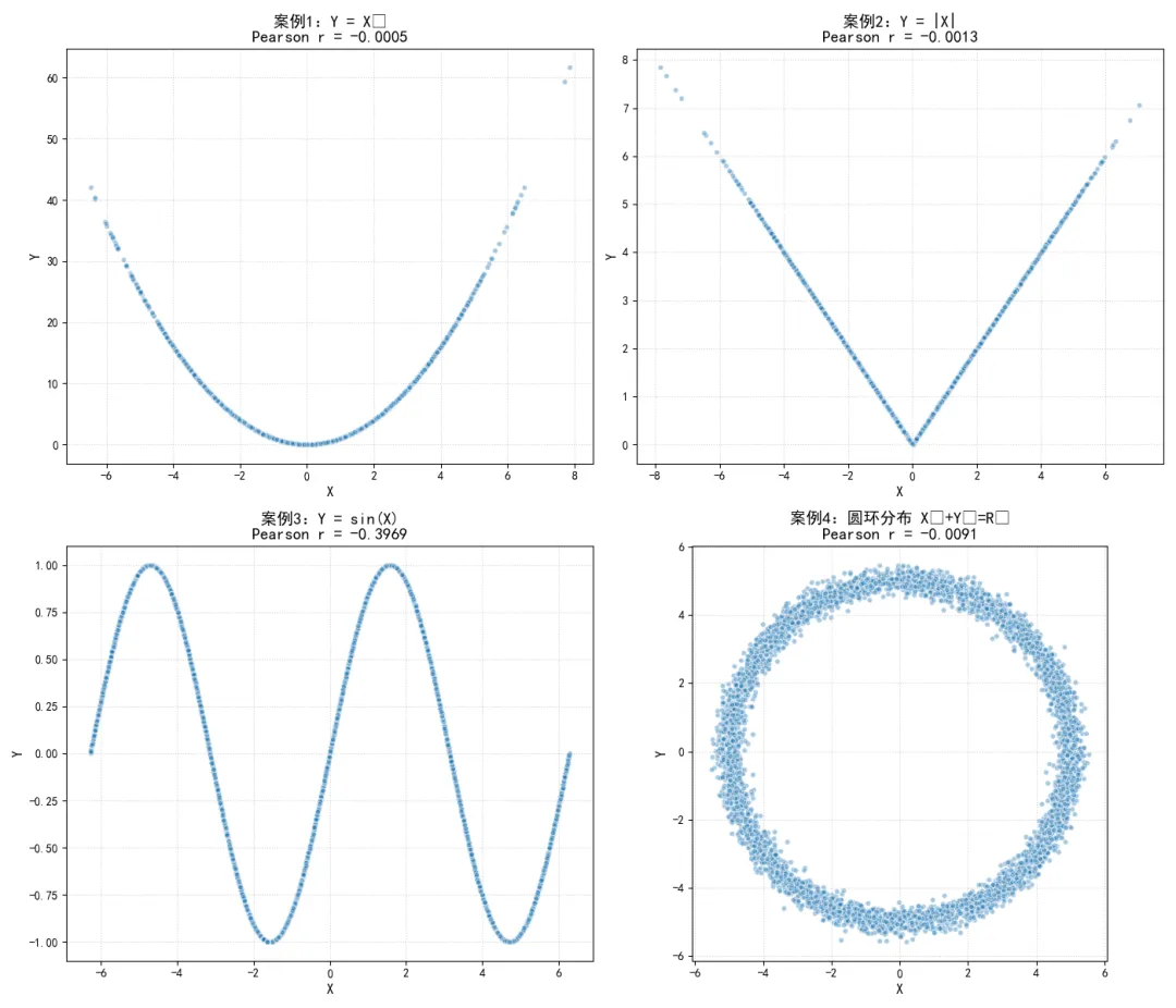 我们通过代码可视化这四个案例,验证相关系数的计算结果,直观展示皮尔逊相关系数对非线性关系的盲区。