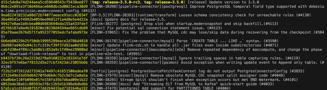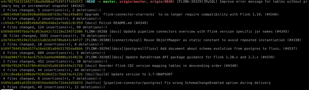 # 查看 flink cdc 在 3.3 和 3.5 之间的 commit 记录git log --pretty=oneline release-3.3.0...release-3.5.0# 查看 starrocks commit ( 只看和 paimon 相关的功能更新 )git log --pretty=oneline 3.3.0...3.5.9 | grep Enhancement | grep Paimon查看版本之间有哪些 commit