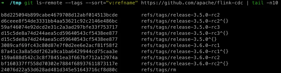 # 在项目根路径执行,查看最近发布的版本git ls-remote --tags --sort="v:refname" | tail -n10# 或: 不用 clone 整个项目,直接指定项目 github 地址查看git ls-remote --tags --sort="v:refname" https://github.com/apache/flink-cdc | tail -n10