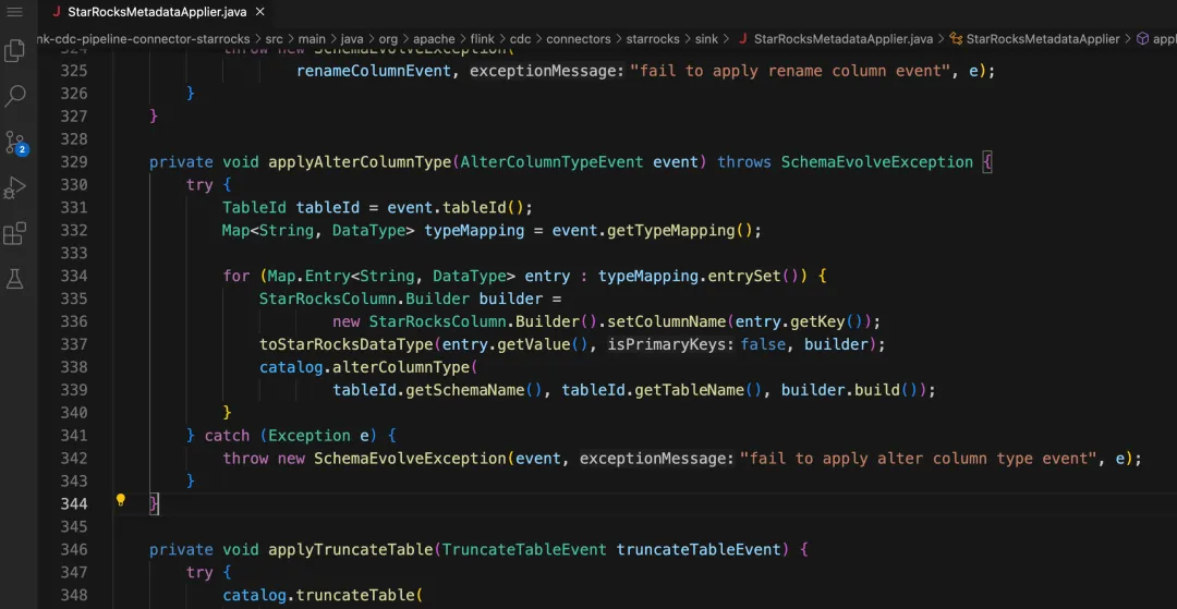 如上 StarRocksMetadataApplier.applyAlterColumnType 是 starrocks 处理列类型修改事件的方法,它的代码在 329-344 行