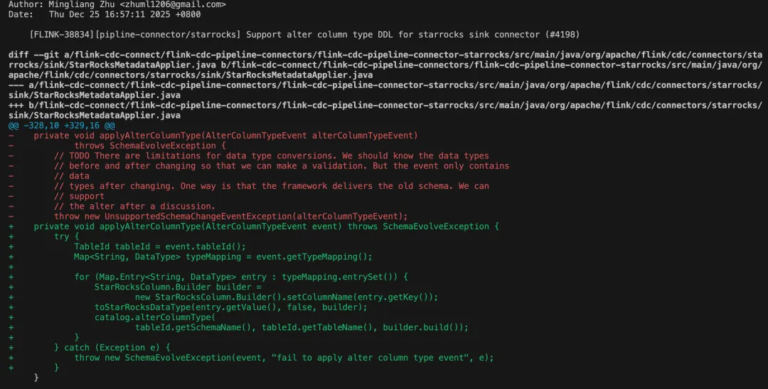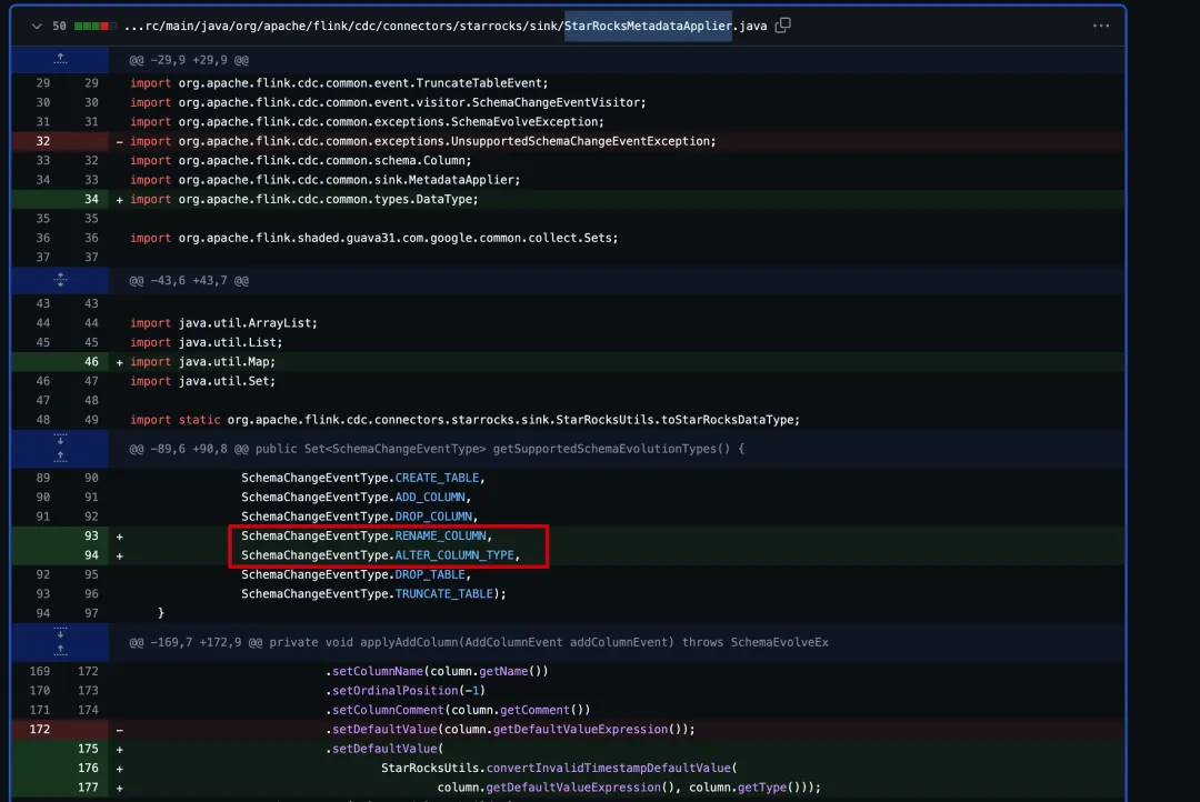 还是以 flink cdc 项目为例: flink cdc 从 3.3 版本升级到最新代码后,将会支持对 starrocks 字段修改的更多语法,在 github 上我们看到代码的变更是这种效果