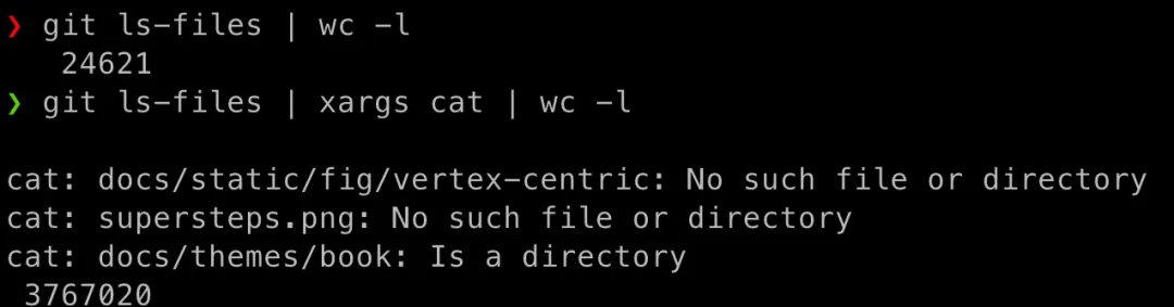 wc -l 是计算行数的指令,和 ls-files 结合,我们可以统计整个项目的文件数和代码行数