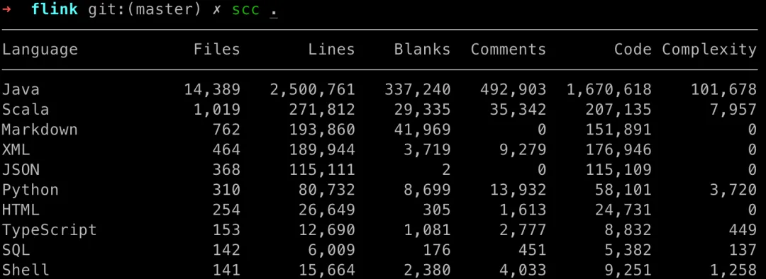 以 apache 组织下代码量和复杂度都比较高的 flink 为例, 代码行数达到了 370 多万