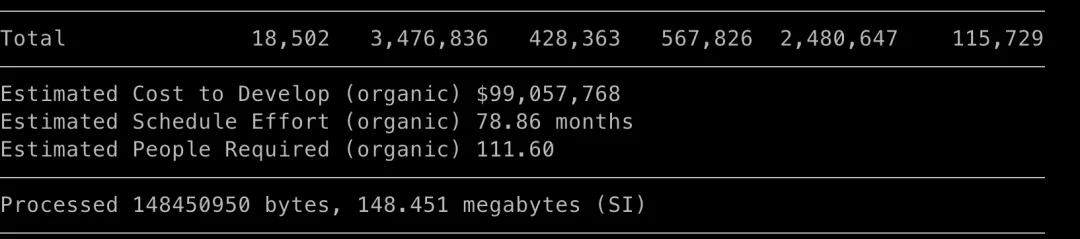 scc[1] 是类似 cloc 的代码统计工具,它可以统计代码行数,以及通过 cocomo ( 构造性成本模型 )算出项目开发所需的时间成本