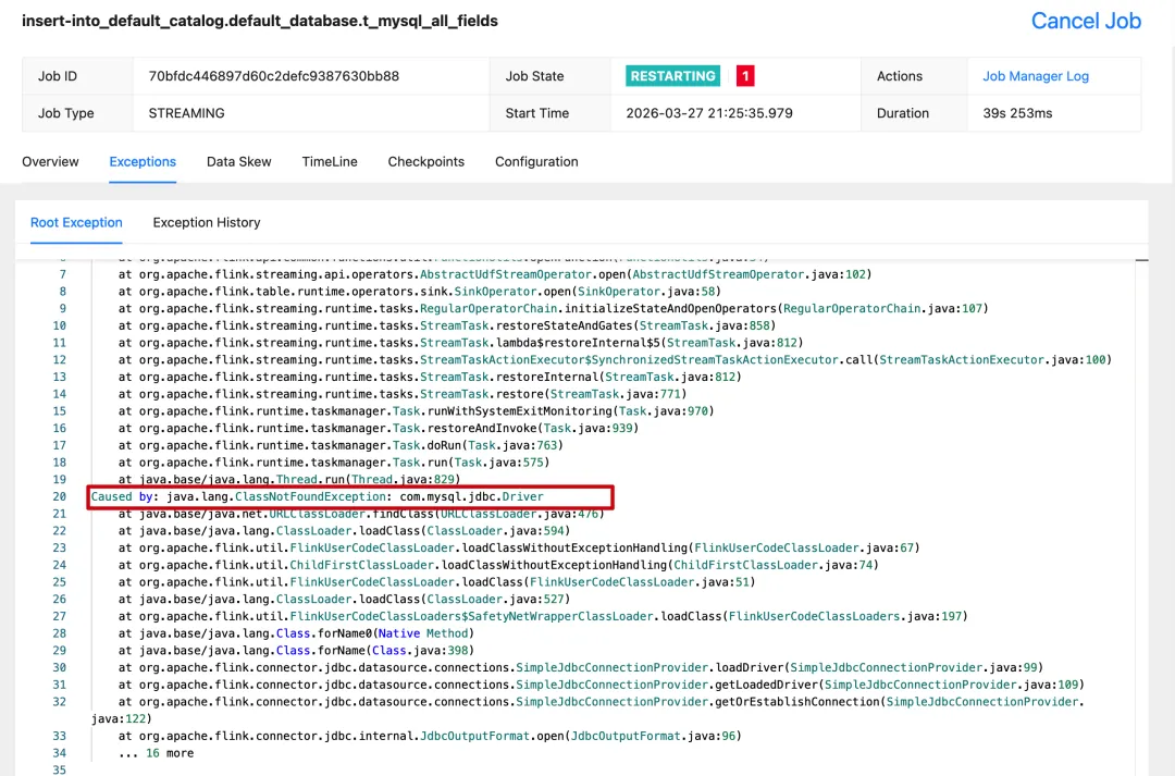 上图是我通过 flink 的 sql 客户端,提交一个 datagen -> mysql 的数据写入任务,但是在 flink 的 lib 目录没有加 mysql-connector-java-{version}.jar 导致的问题
