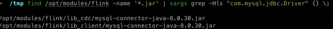 find /opt/modules/flink -name '*.jar' | xargs grep -Hls "com.mysql.jdbc.Driver" {} \;