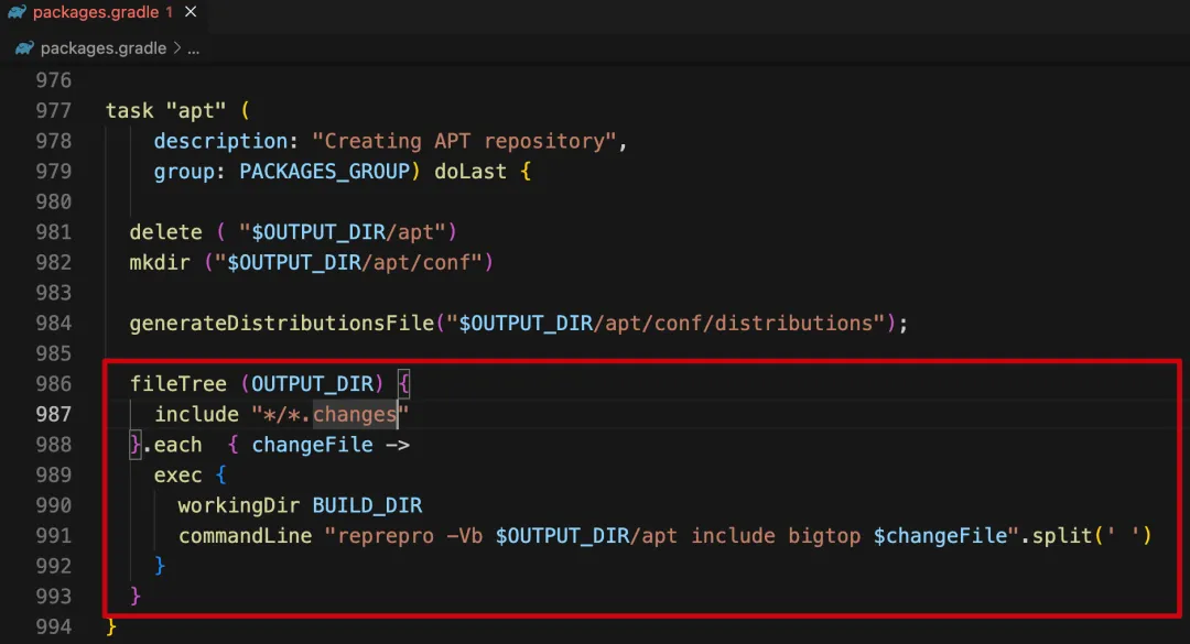 在 packages.gradle 中能看到批量对 changes 文件执行 reprepro 的代码,使用 find + xargs 也可以实现相同操作