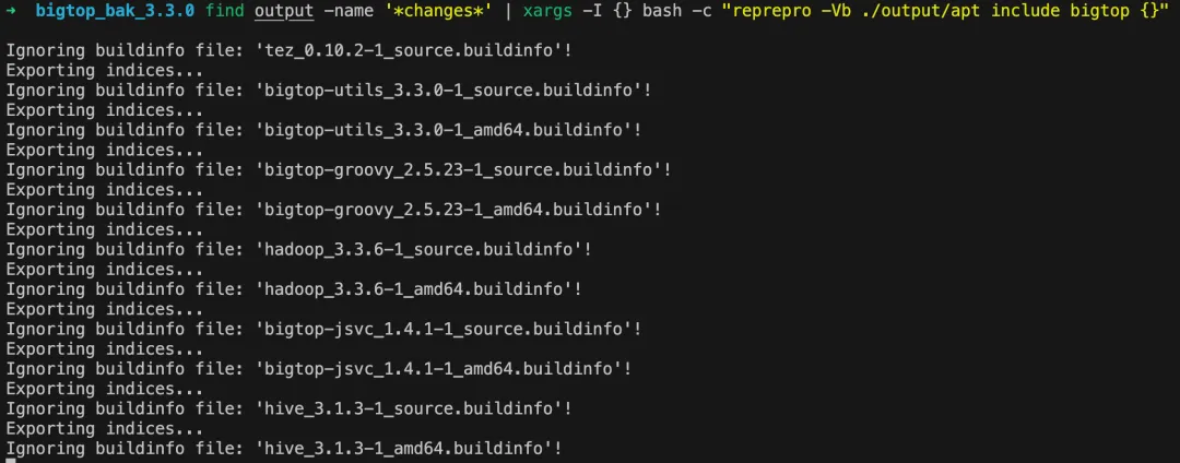 # 批量对每个组件生成 deb 安装包find output -name '*changes*' | xargs -I {} bash -c "reprepro -Vb ./output/apt include bigtop {}"