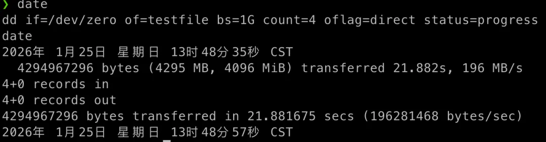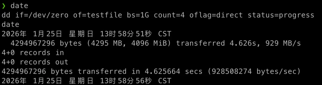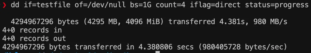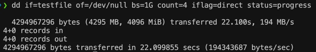 dd if=testfile of=/dev/null bs=1G count=4 iflag=direct status=progressof=/dev/null 表示数据从磁盘读取出来之后不会再写入其他的 IO 设备,因此最终速度就取决于磁盘读取速度