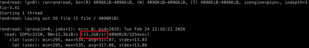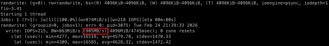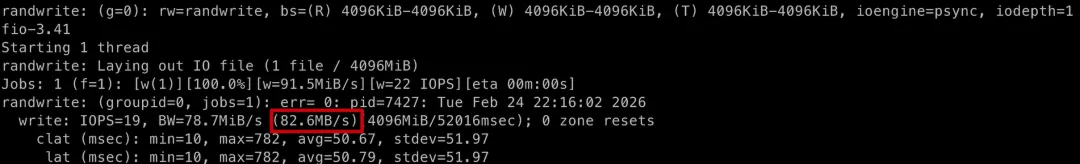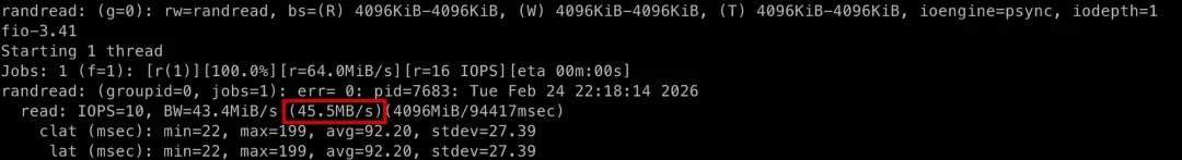 # 随机写fio -filename=fiotest -direct=1 -iodepth=1 -end_fsync=1 -thread -rw=randwrite -ioengine=psync -bs=4M -size=4G -numjobs=1 -group_reporting -name=randwrite# 随机读fio -filename=fiotest -direct=1 -iodepth=1 -end_fsync=1 -thread -rw=randread -ioengine=psync -bs=4M -size=4G -numjobs=1 -group_reporting -name=randreadHDD 的随机读写结果: