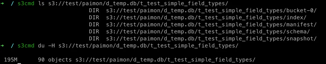 # 上传单个文件、目录s3cmd put --recursive shell-tools s3://test/coding/# 查看目录s3cmd ls s3://test/coding/# 下载文件s3cmd get s3://test/coding/shell-tools/README.md# 统计目录大小s3cmd du -H s3://test/coding/shell-tools# 删除目录s3cmd rm --recursive s3://test/paimon示例:统计一张存入来自 flink datagen 产生的 1kw 条数据的 paimon 表(数据接入 minio ),并查看这个表实际占用磁盘空间大小:
