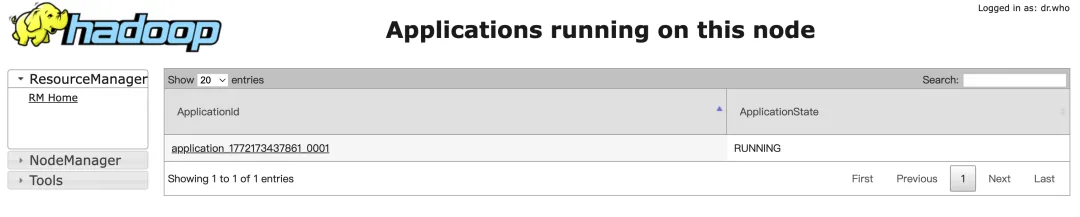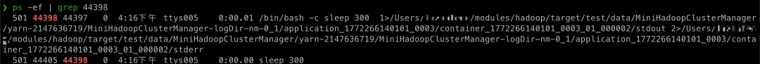 ./bin/hadoop jar share/hadoop/yarn/hadoop-yarn-applications-distributedshell-3.4.3.jar org.apache.hadoop.yarn.applications.distributedshell.Client --jar share/hadoop/yarn/hadoop-yarn-applications-distributedshell-3.4.3.jar --num_containers 1 --container_vcores 1 --container_memory 1024 --shell_command 'sleep 300'任务运行起来之后,你可以在本地进程列表中查到一个正在 "sleep" 的进程,yarn 页面中也能看到这个任务