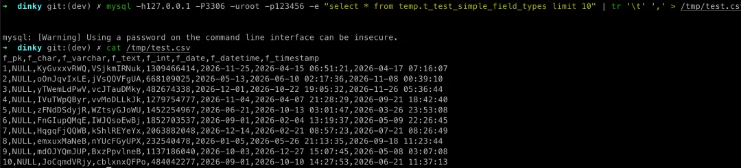使用 mysql 指令直接执行 SQL 导出,这个思路是最直接的。先把数据查出来,再把默认的 tab 分隔符替换成 csv 默认的逗号分隔