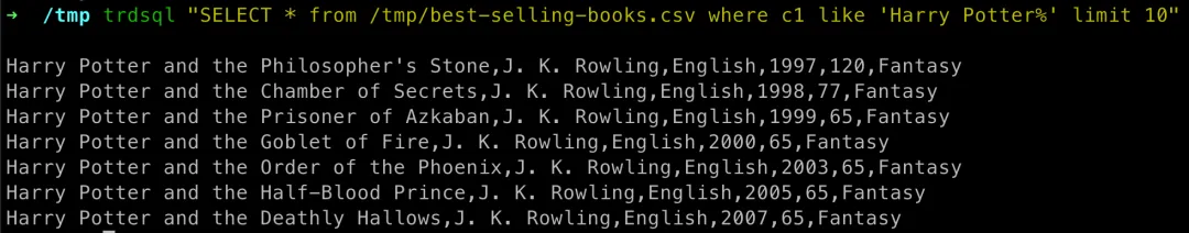 # c1, c2 表示列名trdsql "SELECT * from /tmp/best-selling-books.csv where c1 like 'Harry Potter%' limit 10"# 使用 sqlite3_ext ( https://github.com/multiprocessio/go-sqlite3-stdlib ),支持更多函数trdsql -driver sqlite3_ext "SELECT * from /tmp/best-selling-books.csv where c1 REGEXP 'Harry Potter.*' limit 10"