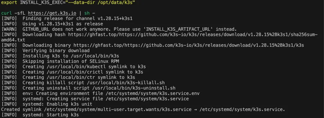 # 一键安装curl -sfL https://get.k3s.io | sh -# 执行脚本前,可通过环境变量设置 k8s 的版本,以及安装路径export INSTALL_K3S_CHANNEL=v1.28.15+k3s1export INSTALL_K3S_EXEC="--data-dir /opt/data/k3s"