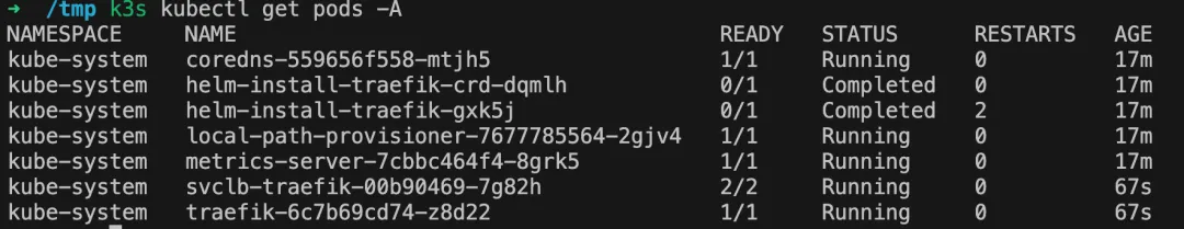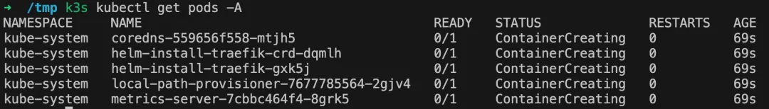安装完成后,k8s 集群还不是马上可用状态,还需稍微等待镜像下载完成。不过 kubectl 相关的指令可以开始跑了,k3s 本身内置 kubectl ,只需在指令之前加上 k3s