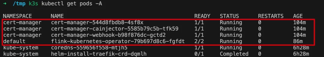 # 部署 cert-manager , flink operator 需要用到k3s kubectl apply -f https://github.com/jetstack/cert-manager/releases/download/v1.18.2/cert-manager.yaml# helm: k3s 没有内置 helm 指令,需要手动安装curl -fsSL -o get_helm.sh https://raw.githubusercontent.com/helm/helm/main/scripts/get-helm-4chmod 700 get_helm.sh./get_helm.sh# 通过 helm 安装和启动 flink operator# 指定 k8s 配置为 k3s 配置,否则 helm 无法访问 k8sexport KUBECONFIG=/etc/rancher/k3s/k3s.yamlhelm repo add flink-operator-repo https://downloads.apache.org/flink/flink-kubernetes-operator-1.14.0helm install flink-kubernetes-operator flink-operator-repo/flink-kubernetes-operator等待 flink operator 启动完成后,我们就可以通过 FlinkDeployment 来完成 flink 服务和应用的部署了: