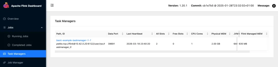 # 暴露 jobmanager 端口k3s kubectl port-forward service/basic-example-rest 8081 --address='0.0.0.0'# 查看 basic-example pod 的日志,即 StateMachineExample 任务日志k3s kubectl logs -l app=basic-example -l component=taskmanager --tail=10 -f访问 http://机器ip:8081 即可查看 flink 原生页面
