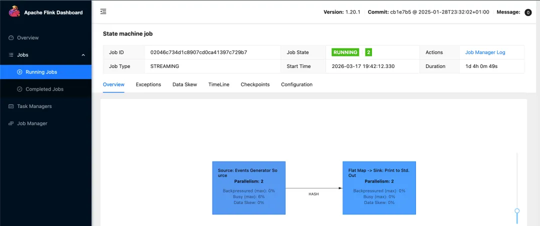 最后是查看 StateMachineExample 任务输出的日志,可通过 kubectl logs 或者直接在 jobmanager 页面中查看