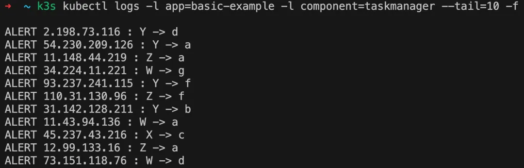 k3s kubectl logs -l app=basic-example -l component=taskmanager --tail=10 -f