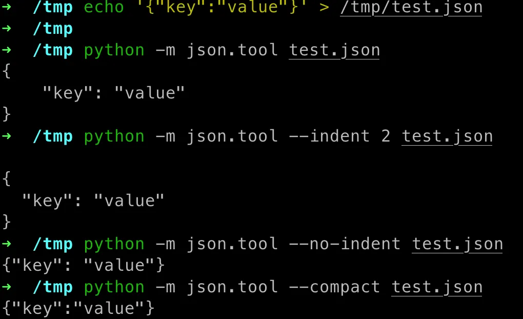 # 格式化python -m json.tool test.json# 2个空格格式化python -m json.tool --indent 2 test.json# 不加换行符,key 之间按一个空格分隔python -m json.tool --no-indent test.json# 完全紧凑,中间没有空格的排版python -m json.tool --compact test.json