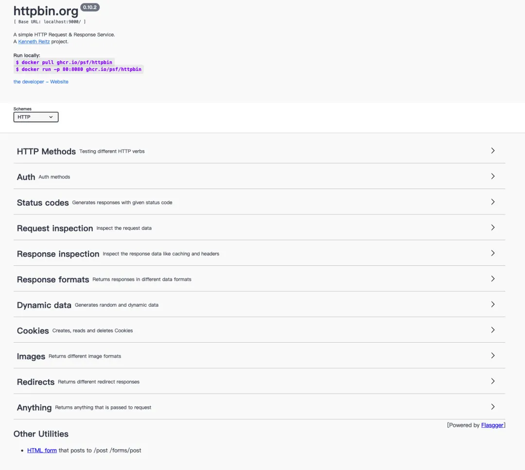 pip install httpbin==0.10.2python -m httpbin.core --host 0.0.0.0 --port 9000先来看它提供的 swagger 界面,包含所有接口的功能介绍: