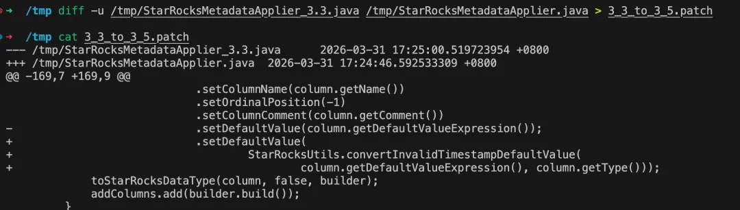 # 先准备 StarRocksMetadataApplier.java 在 3.3 分支和最新分支的代码文件wget https://raw.githubusercontent.com/apache/flink-cdc/refs/heads/master/flink-cdc-connect/flink-cdc-pipeline-connectors/flink-cdc-pipeline-connector-starrocks/src/main/java/org/apache/flink/cdc/connectors/starrocks/sink/StarRocksMetadataApplier.java -O StarRocksMetadataApplier_master.javawget https://raw.githubusercontent.com/apache/flink-cdc/refs/tags/release-3.3.0/flink-cdc-connect/flink-cdc-pipeline-connectors/flink-cdc-pipeline-connector-starrocks/src/main/java/org/apache/flink/cdc/connectors/starrocks/sink/StarRocksMetadataApplier.java -O StarRocksMetadataApplier_3.3.java# 生成单个文件的变更 patch 文件diff -u StarRocksMetadataApplier_3.3.java StarRocksMetadataApplier_master.java > StarRocksMetadataApplier_3_3_to_master.patch# 验证 patch 是否可以生效,不会真正修改文件patch -p0 --dry-run StarRocksMetadataApplier_3.3.java < StarRocksMetadataApplier_3_3_to_master.patch# 应用 patch 变更patch -p0 /tmp/StarRocksMetadataApplier_3.3.java < StarRocksMetadataApplier_3_3_to_master.patch# 应用 patch 变更,并备份原始文件为 StarRocksMetadataApplier_3.3.java.bakpatch -p0 -b -z .bak StarRocksMetadataApplier_3.3.java < StarRocksMetadataApplier_3_3_to_master.patch# 回退patch -p0 -R StarRocksMetadataApplier_3.3.java < StarRocksMetadataApplier_3_3_to_master.patchpatch 文件内容如下图,和 github 上显示的效果基本一致