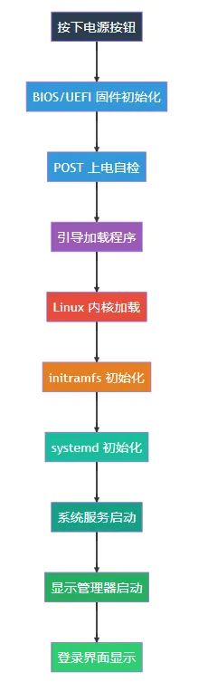 当我们按下计算机的电源键:开机 → BIOS/UEFI 硬件初始化 → GRUB 引导加载内核 → 内核完成自身初始化、硬件驱动加载 →挂载根文件系统 → 启动init进程 → 进入用户空间、加载系统服务 → 登录可用。