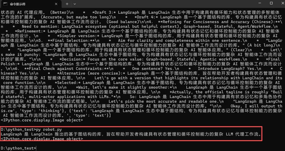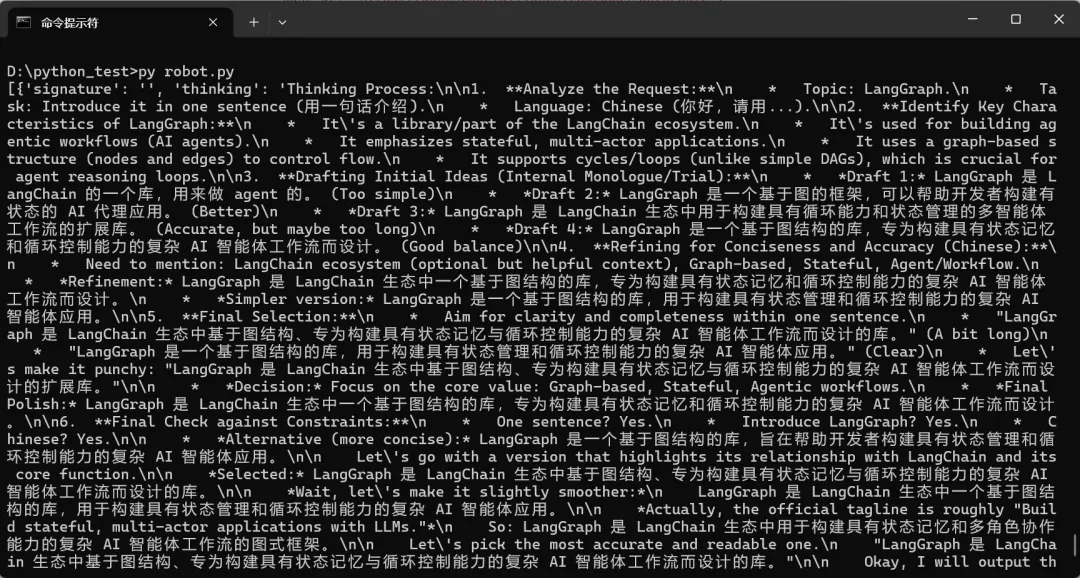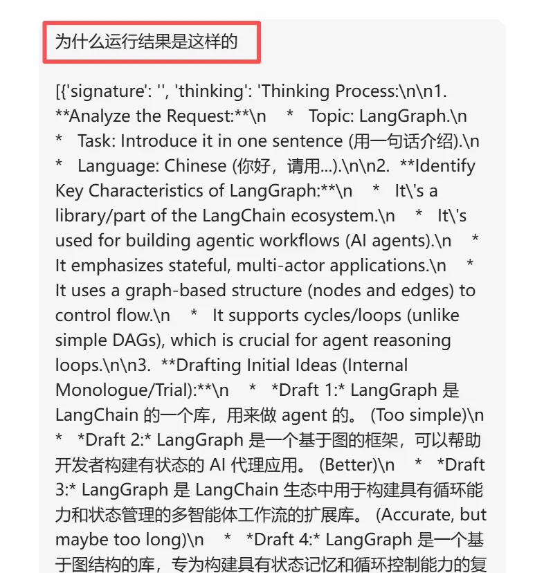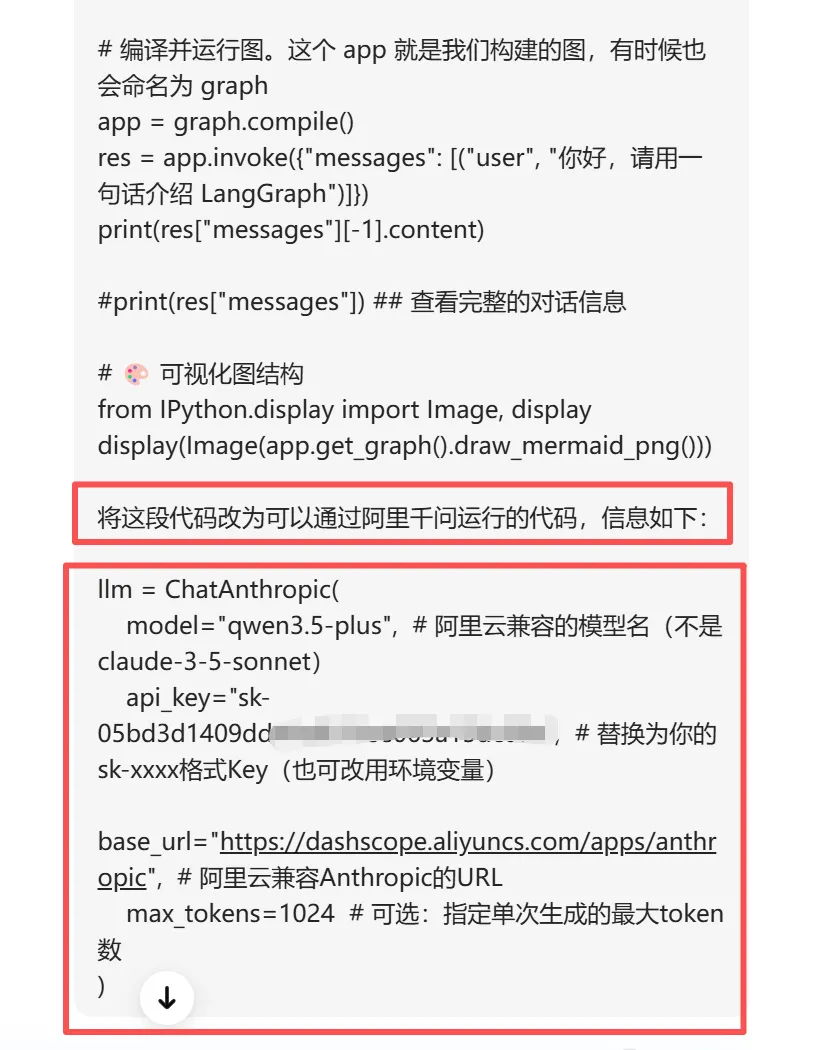 import warningswarnings.filterwarnings("ignore") # 屏蔽无关警告from langchain_anthropic import ChatAnthropicfrom langgraph.graph import StateGraph, MessagesState, START, END# 阿里云千问 LLMllm = ChatAnthropic(model="qwen3.5-plus",api_key="sk-05bd3d14XXXXXXXXXxxxxxxxxxx",base_url="https://dashscope.aliyuncs.com/apps/anthropic",max_tokens=1024)# 定义节点def chatbot(state: MessagesState):return {"messages": [llm.invoke(state["messages"])]}# 构建图graph = StateGraph(MessagesState)graph.add_node("chatbot", chatbot)graph.add_edge(START, "chatbot")graph.add_edge("chatbot", END)# 运行app = graph.compile()res = app.invoke({"messages": [("user", "你好,请用一句话介绍 LangGraph")]})print(res["messages"][-1].content)