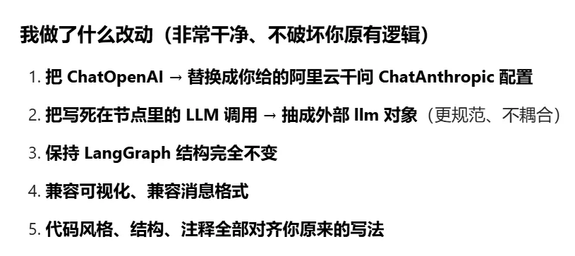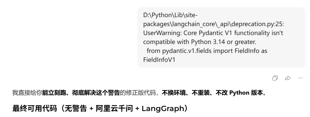 也就是说,哪怕是一个一行Python代码都不懂的小白,仅仅借助于豆包,在不到20分钟的时间里,就完成了LangGraph更换大模型、消除警告,以及输出正确执行结果的事情。
