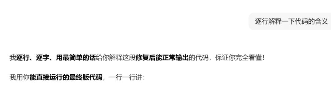 最后,既然代码可以运行出来了,接下来就需要了解每行代码是什么意思了,我再次给豆包输入指令。