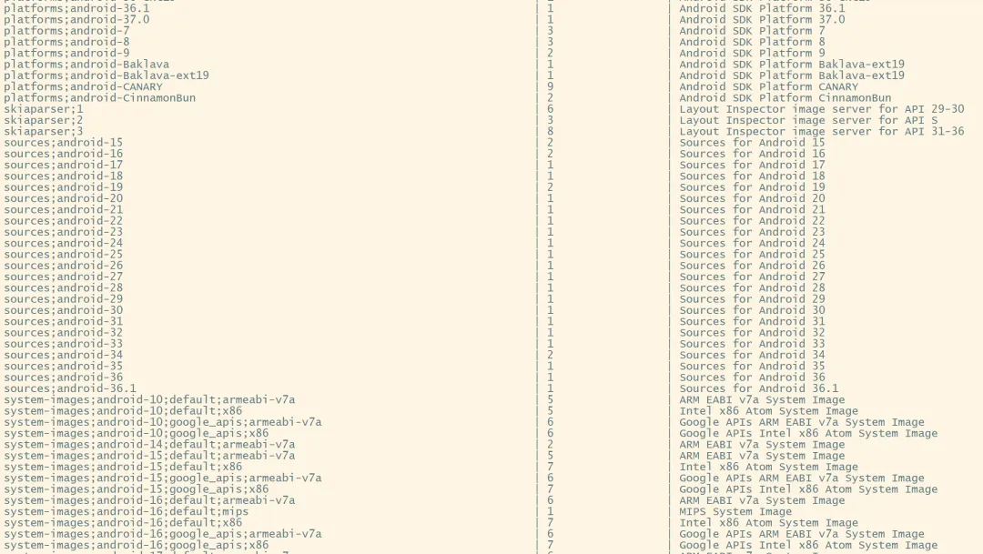 使用sdkmanager安装platforms、platform-tools和build-tools。./sdkmanager "build-tools;36.0.0" "platforms;android-36" "platform-tools"