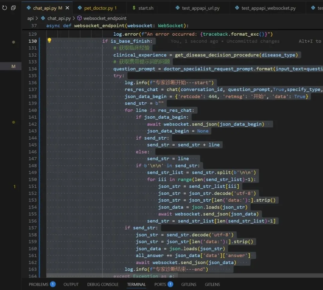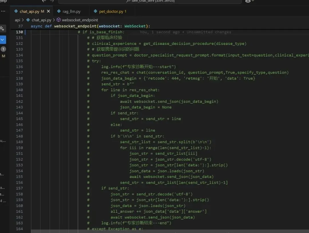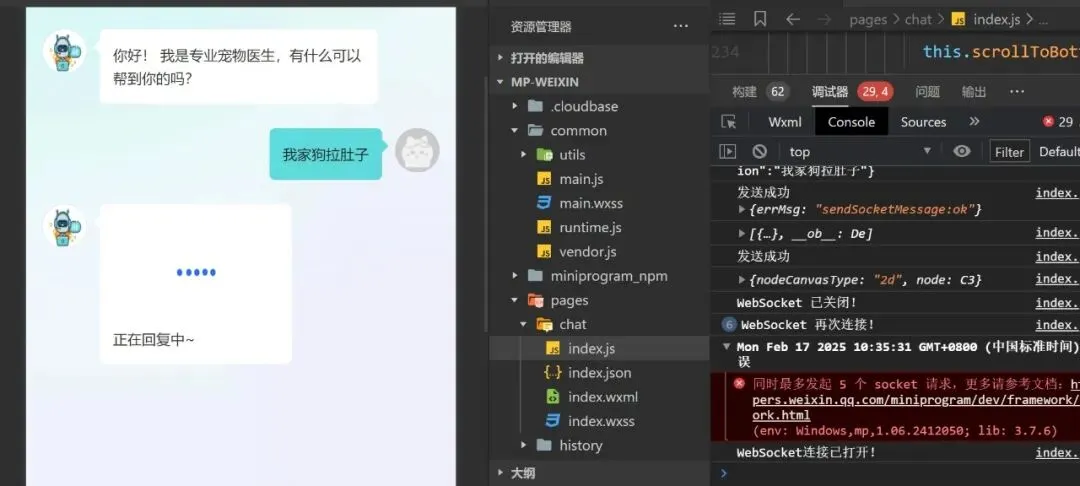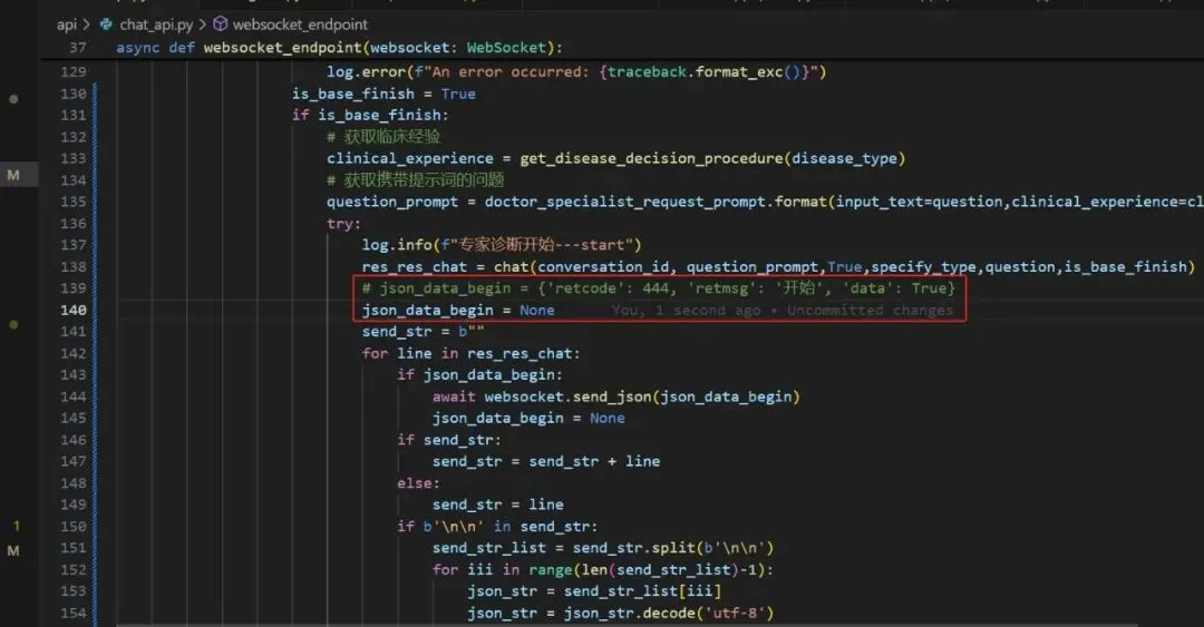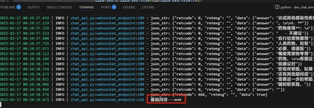注:这就正常回复了,还有一个关键点是,chat_sev进行专家诊断时,要把444那个发送去掉,因为小程序端对此有处理,修改程序如下:
