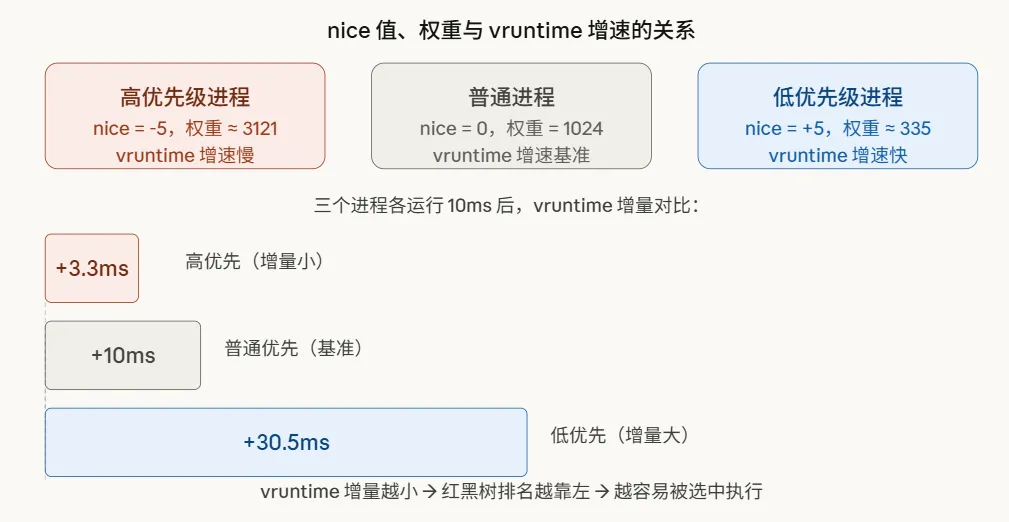 vruntime 增量 = 实际运行时间 × (nice=0的权重 / 该进程的权重)这意味着:高优先级(低 nice 值)进程的权重大,同样跑了 10ms,它的 vruntime 增加得少——下次被选中的概率更高,实际上获得了更多 CPU 时间。