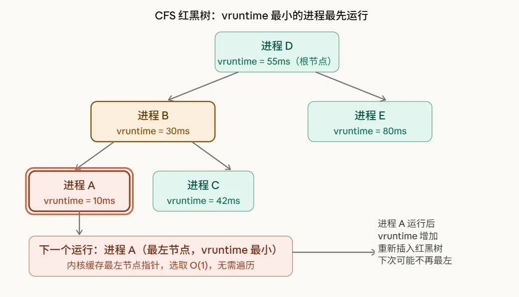 红黑树的最左节点,就是 vruntime 最小的进程——每次调度,直接取最左节点,O(log n) 时间,但内核缓存了最左节点指针,实际是 O(1)。